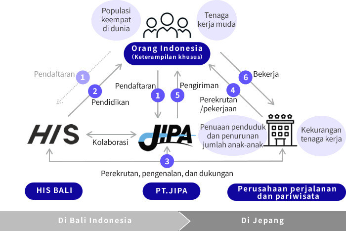 Dengan memberikan pelatihan kerja di Bali bagi generasi muda Indonesia yang ingin bekerja di Jepang, kami akan menciptakan landasan bagi mereka untuk bekerja sebagai orang asing memiliki kualifikasi khusus (dengan beberapa pelatihan magang teknis). Setelah itu, kami memberangkatkan sumber daya manusia yang diperlukan.